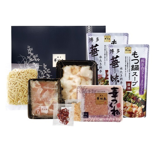 | 内容量 | もつ鍋スープ600g×2、牛小腸200g×1、鶏はらみ100g×1、華つくね200g×1、ちゃんぽん麺150g×1、にんにくスライス5g×1、唐辛子1g×1 |