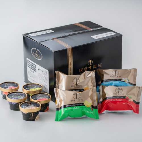 | 内容量 | プレミアムアイス(カスタードバニラ・とちおとめ・マスカット・ピーチ・ブルーベリーチーズ)各90ml×各1、プレミアムシューアイス(いちご・クラウンメロン・マンゴー・カスタードバニラ)×各1 |